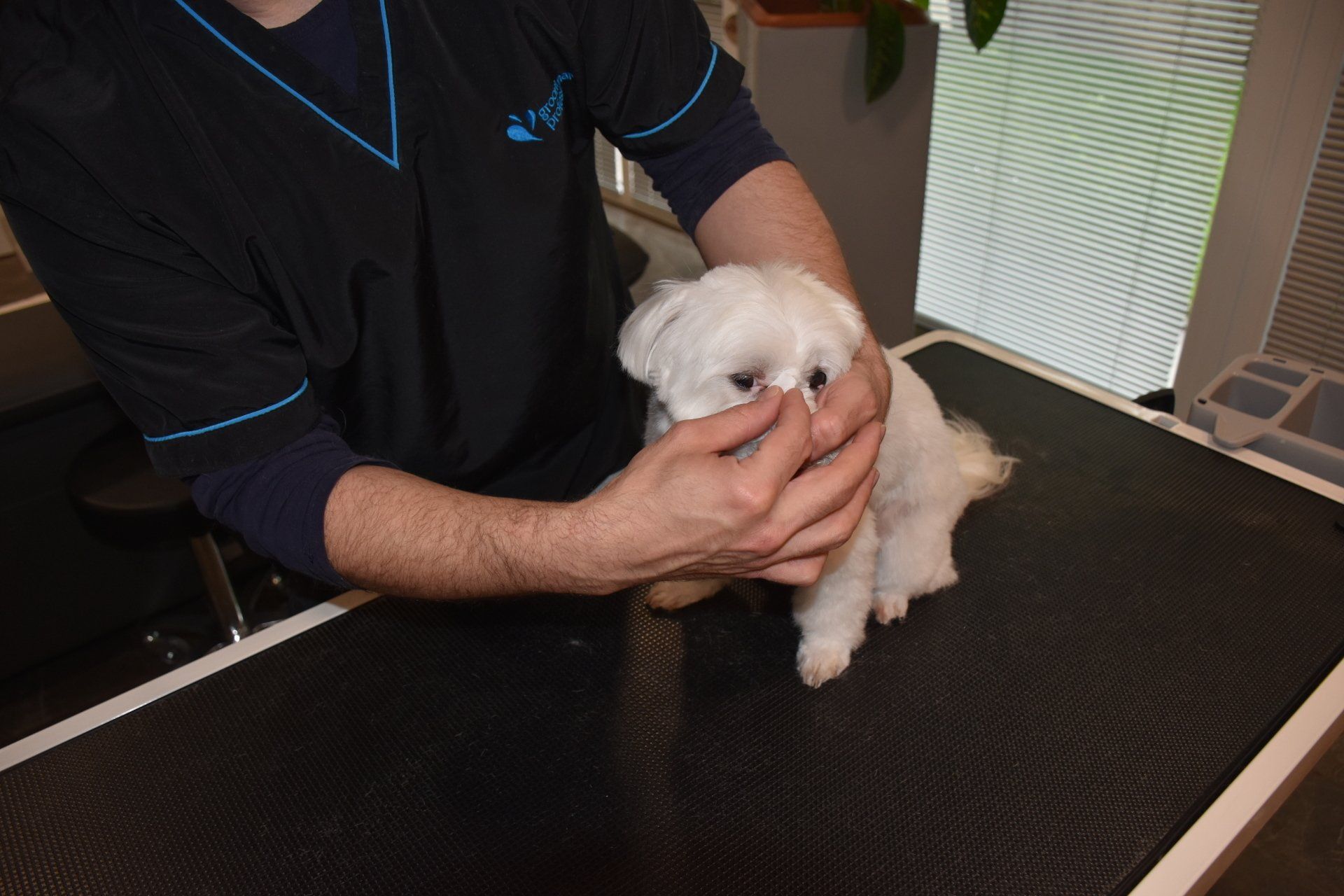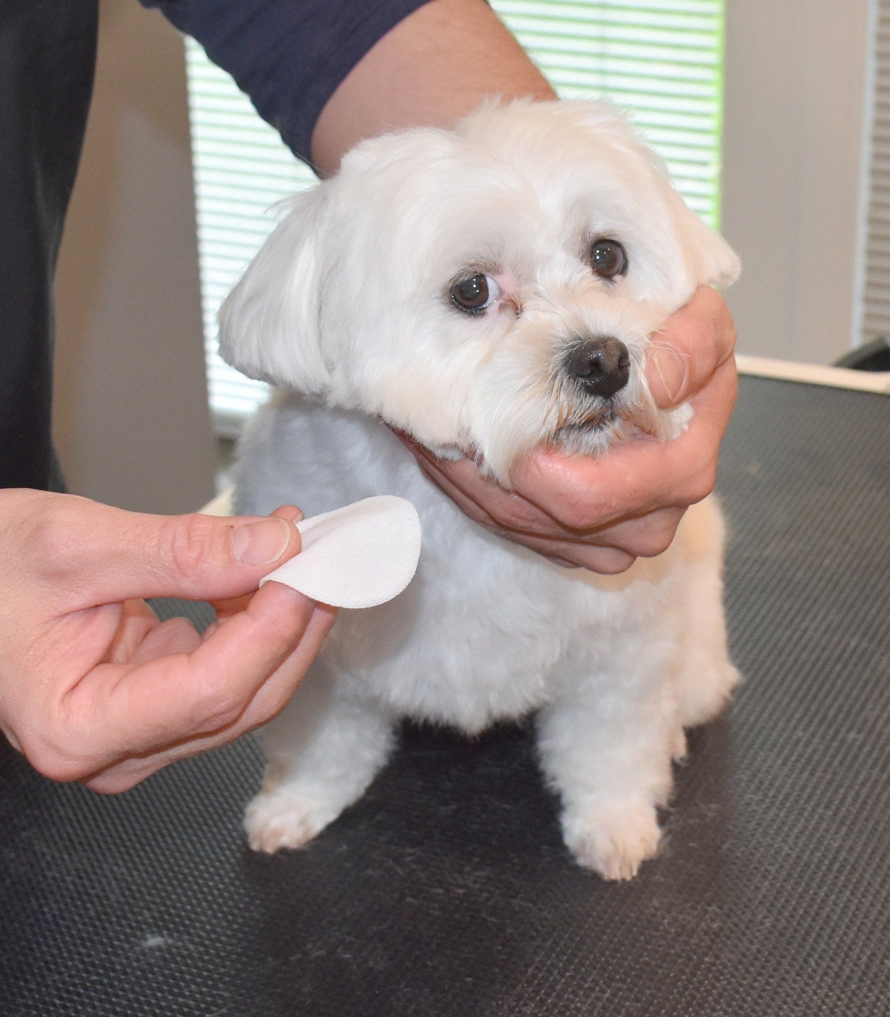Bei jeder Behandlung reinigen wir sanft die Augen ihres Hundes und entfernen vorhandenen Verkrustungen. Diese werden gegebenenfalls eingeweicht bevor diese ohne schmerzen gelöst werden können. Wir haben unterschiedliche Produkte die wir beim Waschen und auch nachdem Waschen auftragen können. Bitte beachten sie das starke Verfärbungen gerade bei weißen Hunden teilweise nicht weggehen da sie zu stark eingebrannt sind.