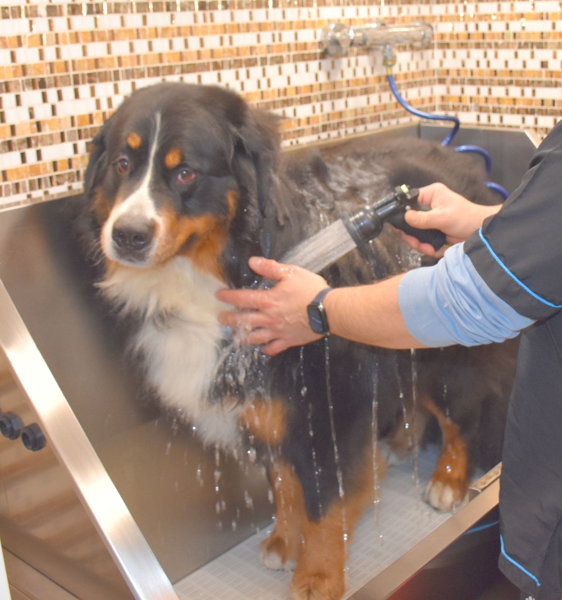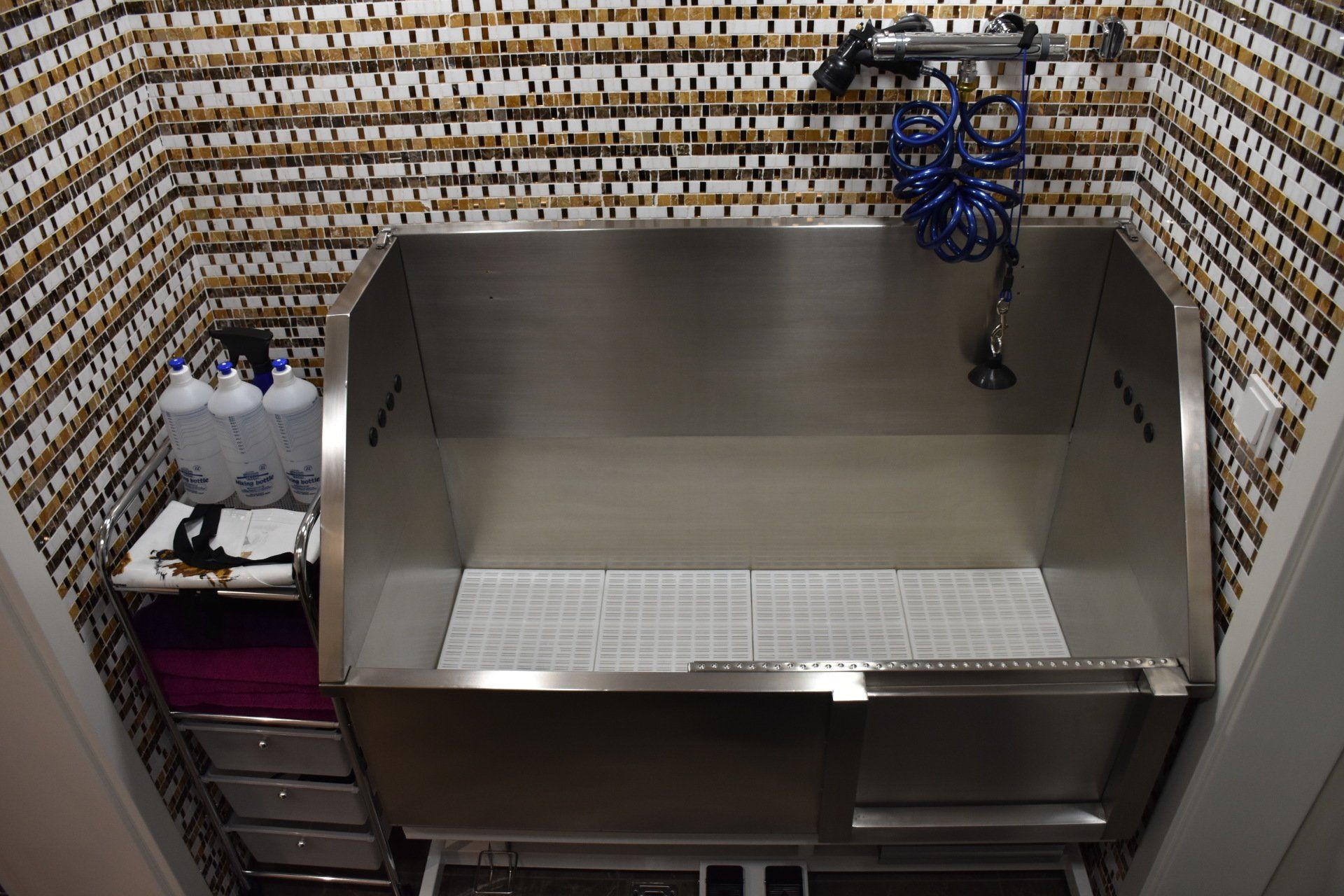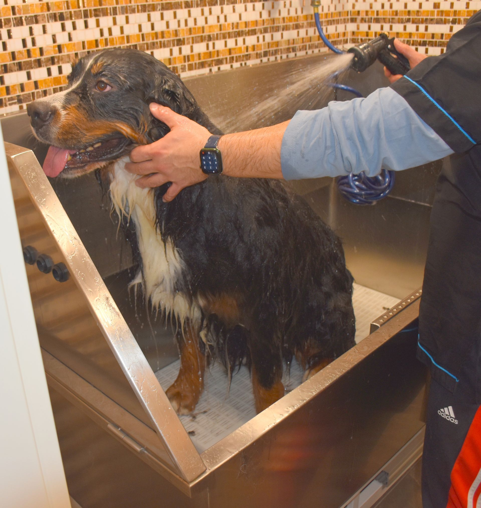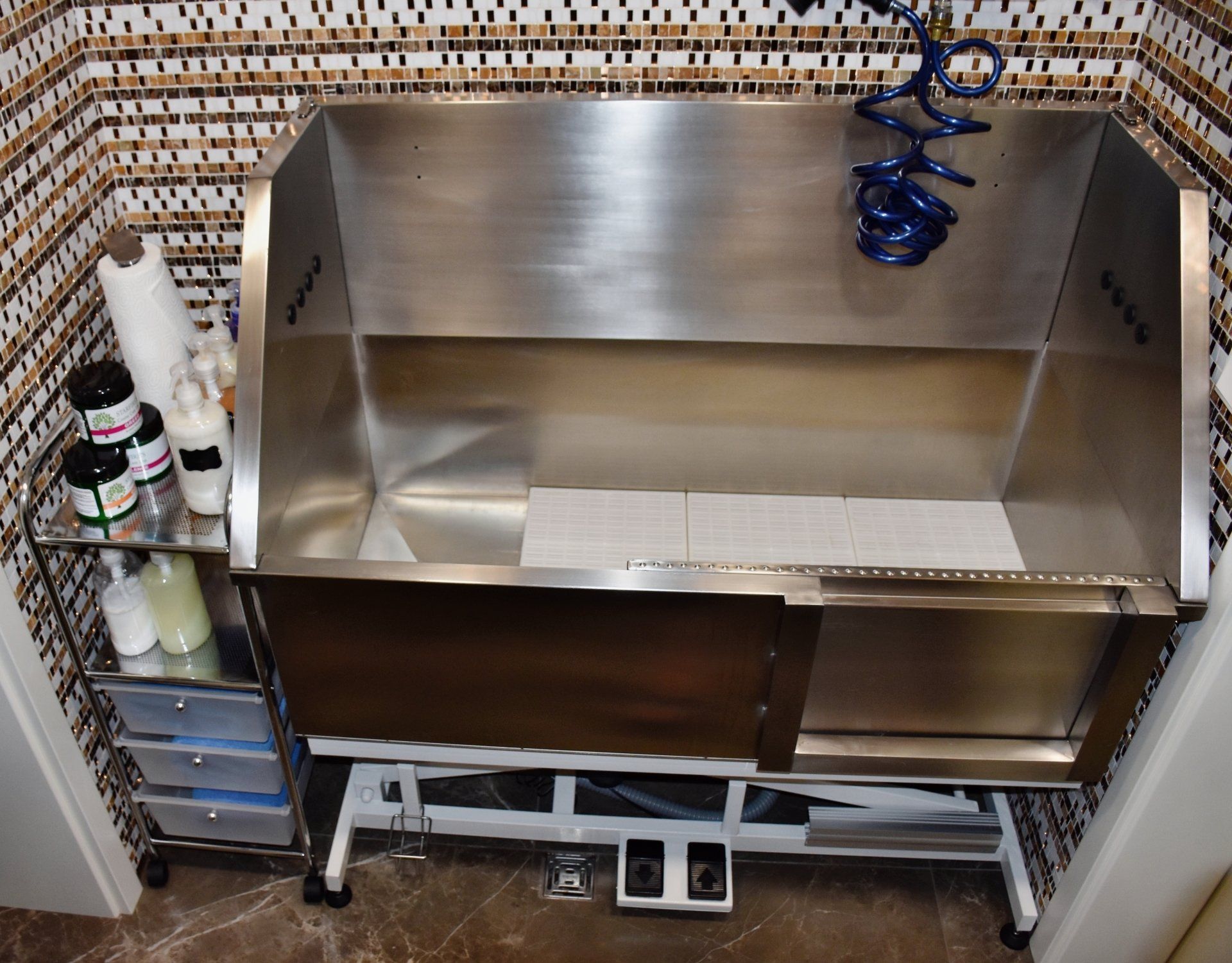Bei uns im Salon wird Ihr Liebling bei jedem Besuch gebadet. Wir haben eine hydraulische Badewanne die auch großen Hunden einen schonenden Einstieg ermöglicht. Sie kann beliebig in der Höhe verstellt werden und hat eine Tür zum Einstieg. Anbei sehen Sie Bilder von unserer hydraulischen Badewanne die für alle Hunderassen geeignet ist. Sie ist 120 cm x 60 cm groß. Wir arbeiten dabei ohne Anbindung oder Fixierung des Hundes.