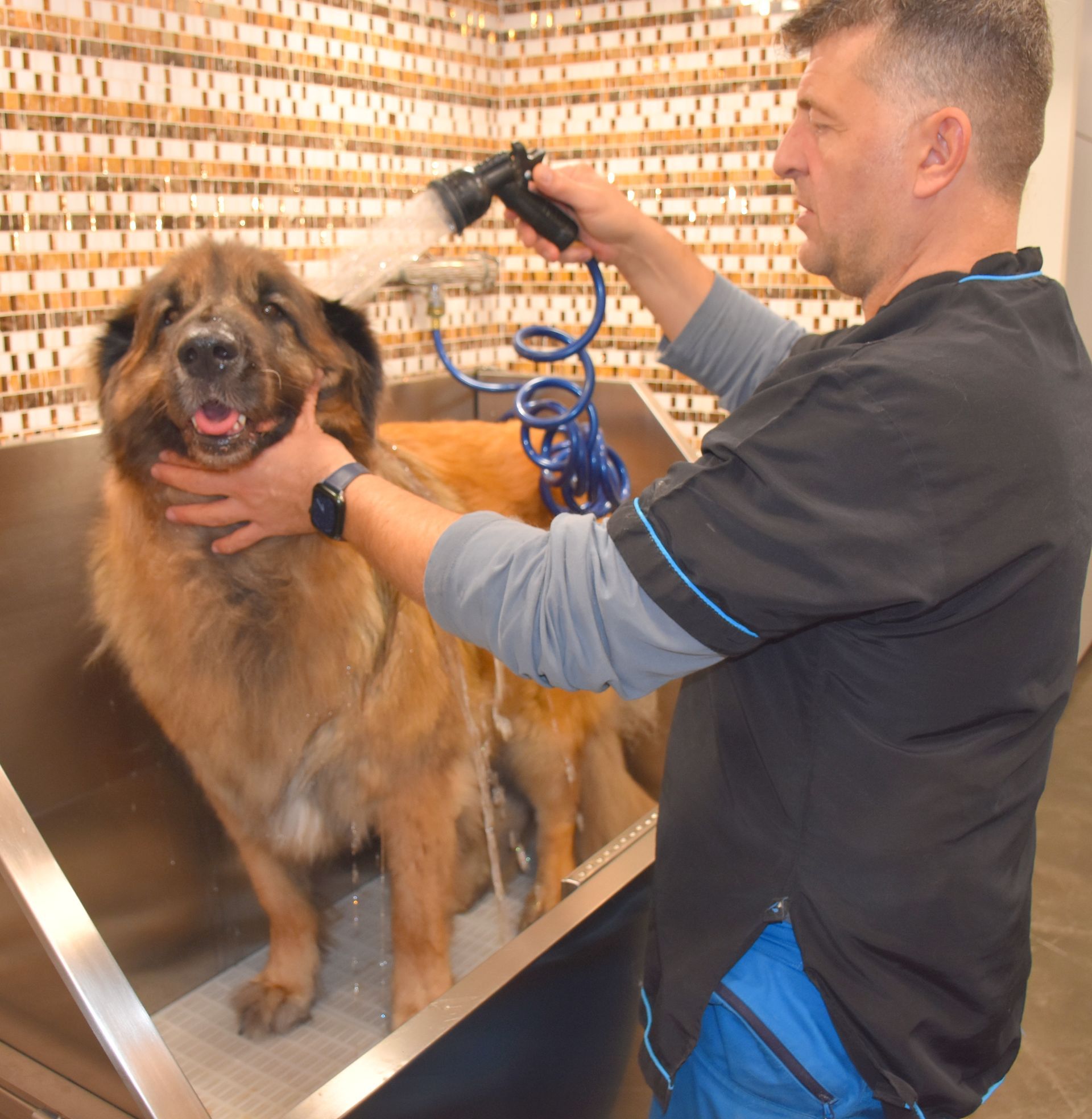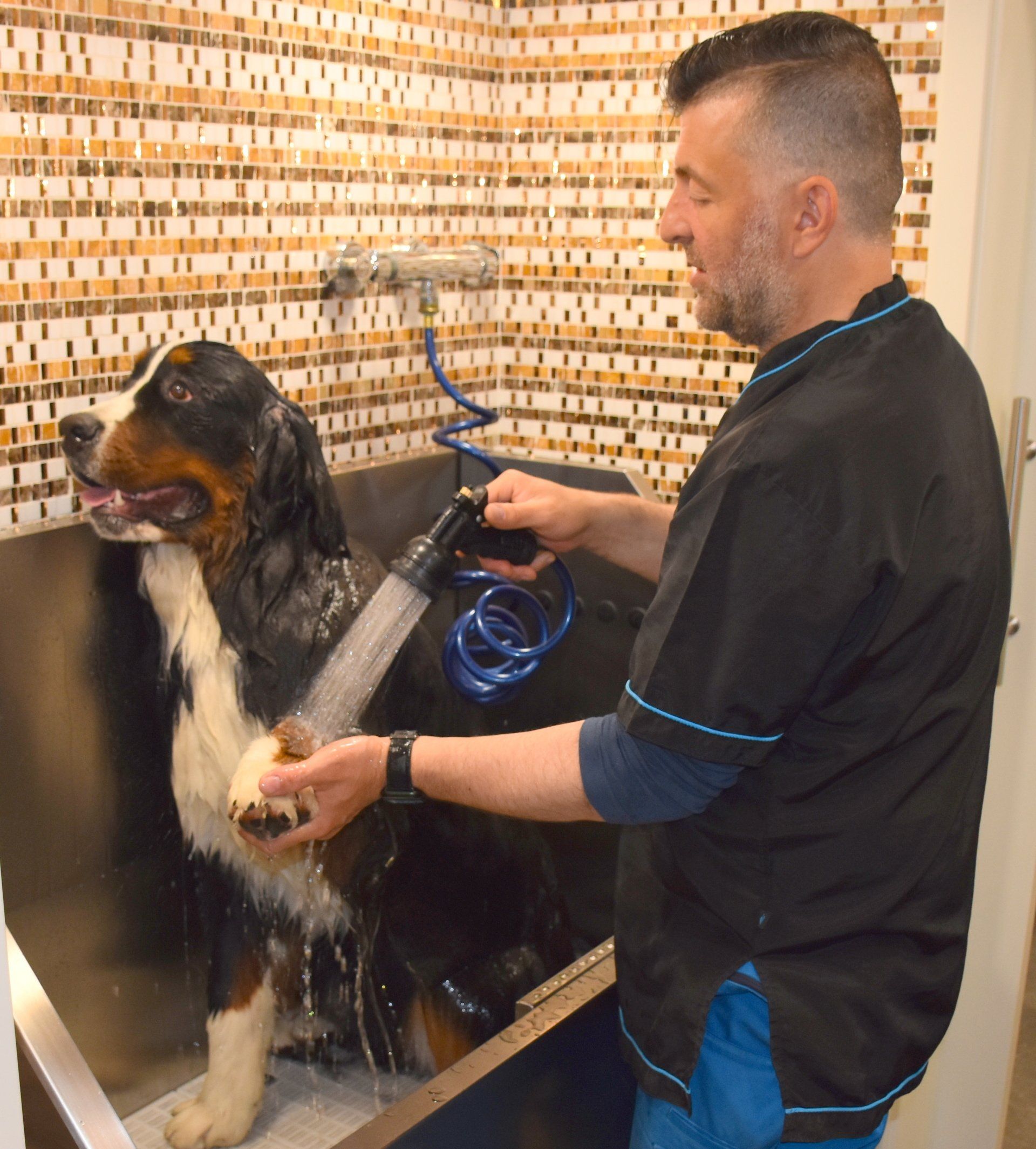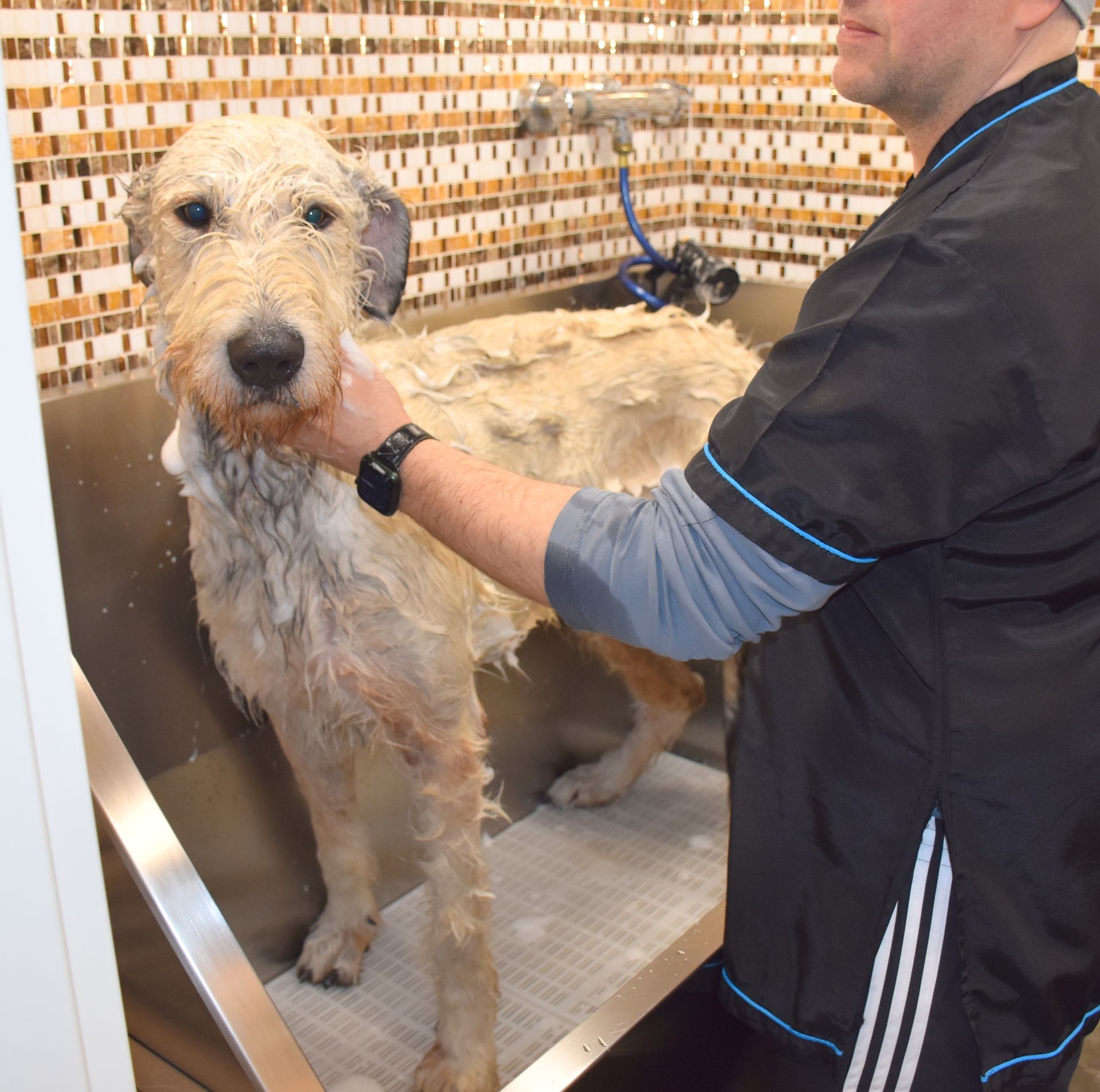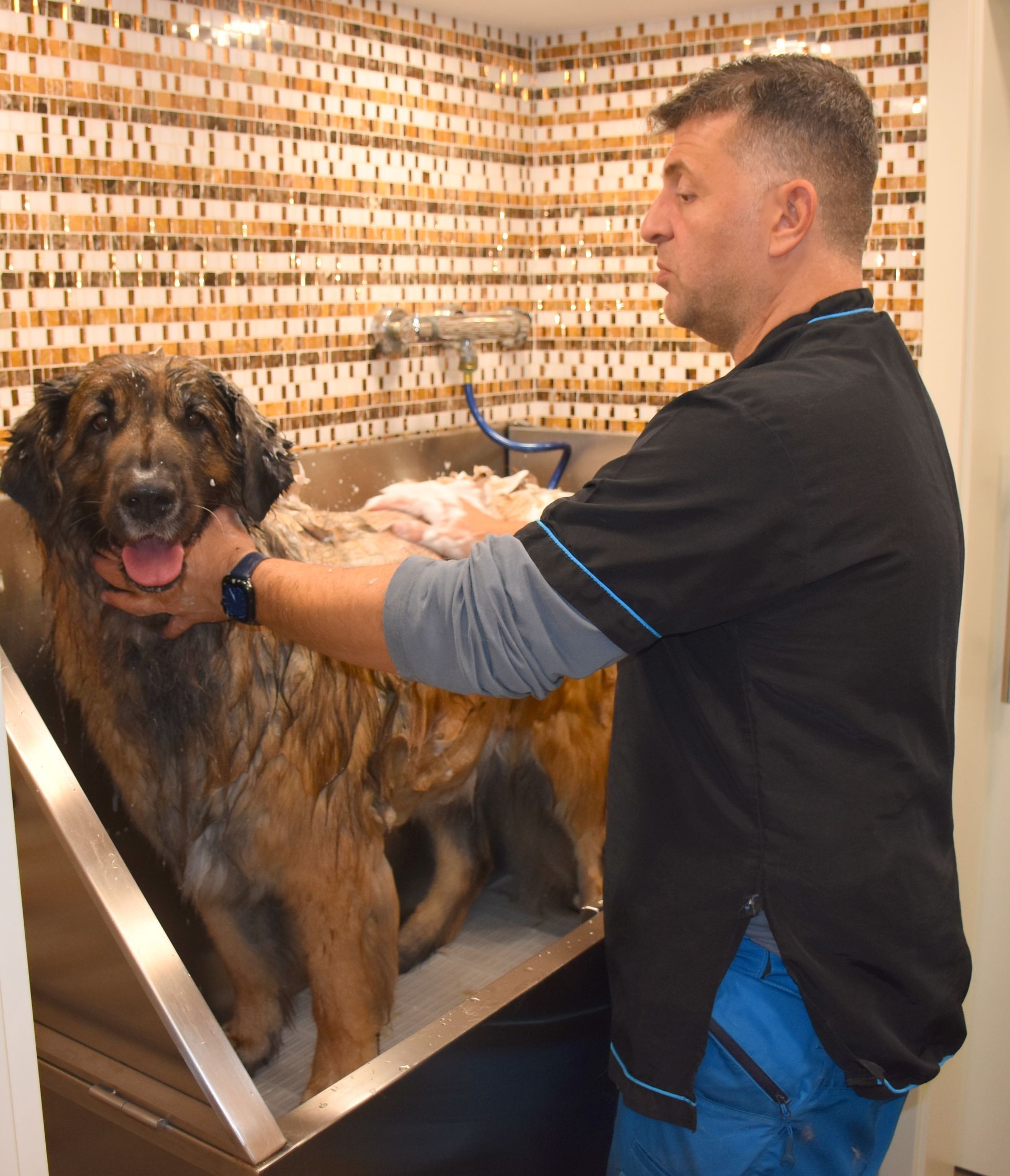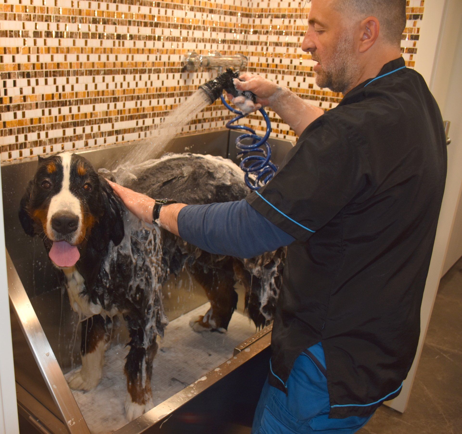 Grundsätzlich benutzen wir ein Shampoo und einen Conditioner der auf das Fell und die Haut Ihres Hundes abgestimmt wird. Sollten Sie ein spezielles Shampoo wünschen zum Beispiel Vegan oder Duftneutral sprechen Sie und bitte an. Wir achten auf die richtige Wassertemperatur. Die wir selbstverständlich beliebig regulieren können. Anbei sehen Sie Bilder eines kleinen Hundes und eines großen Hundes der im Salon gebadet wurde.