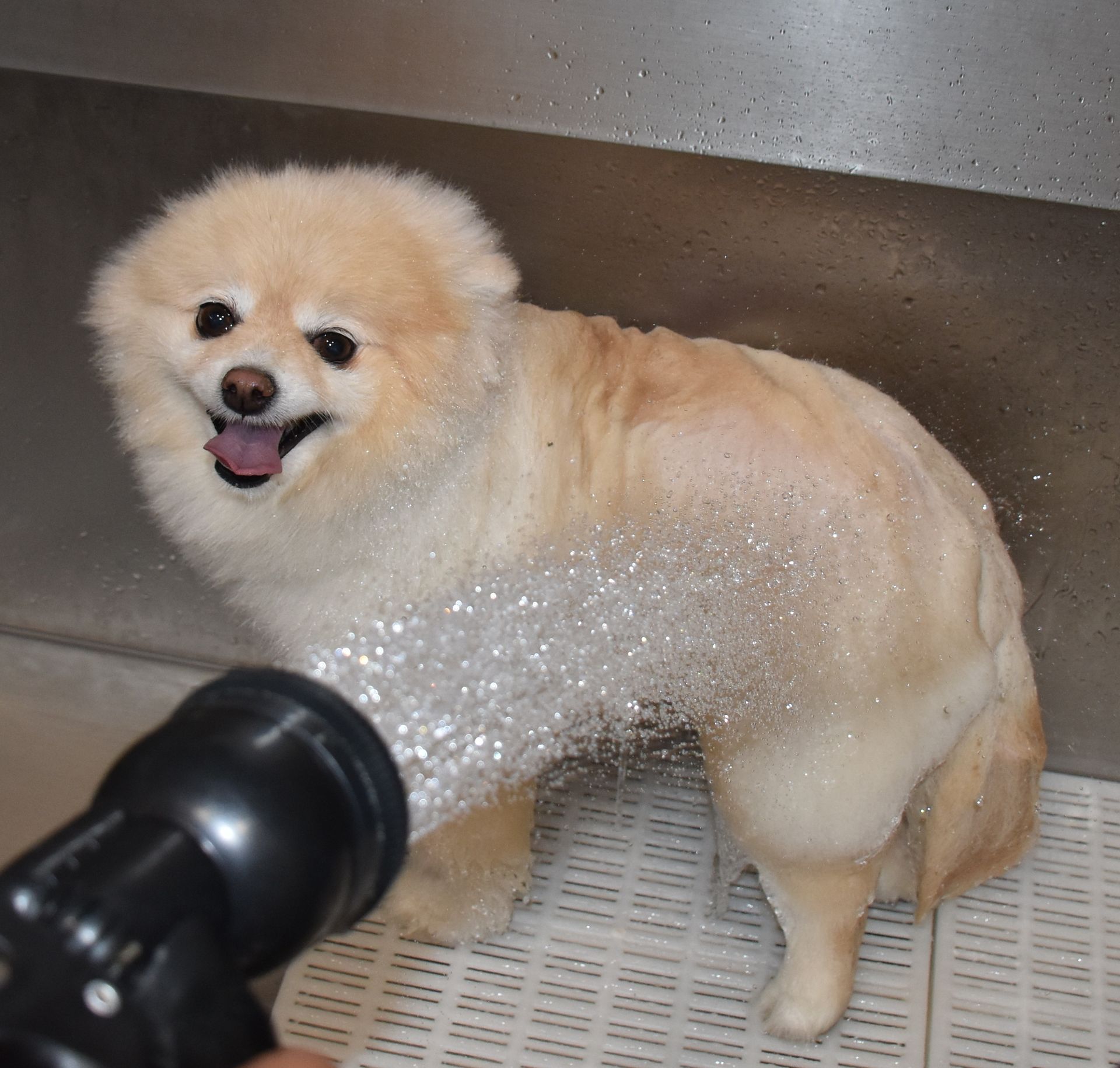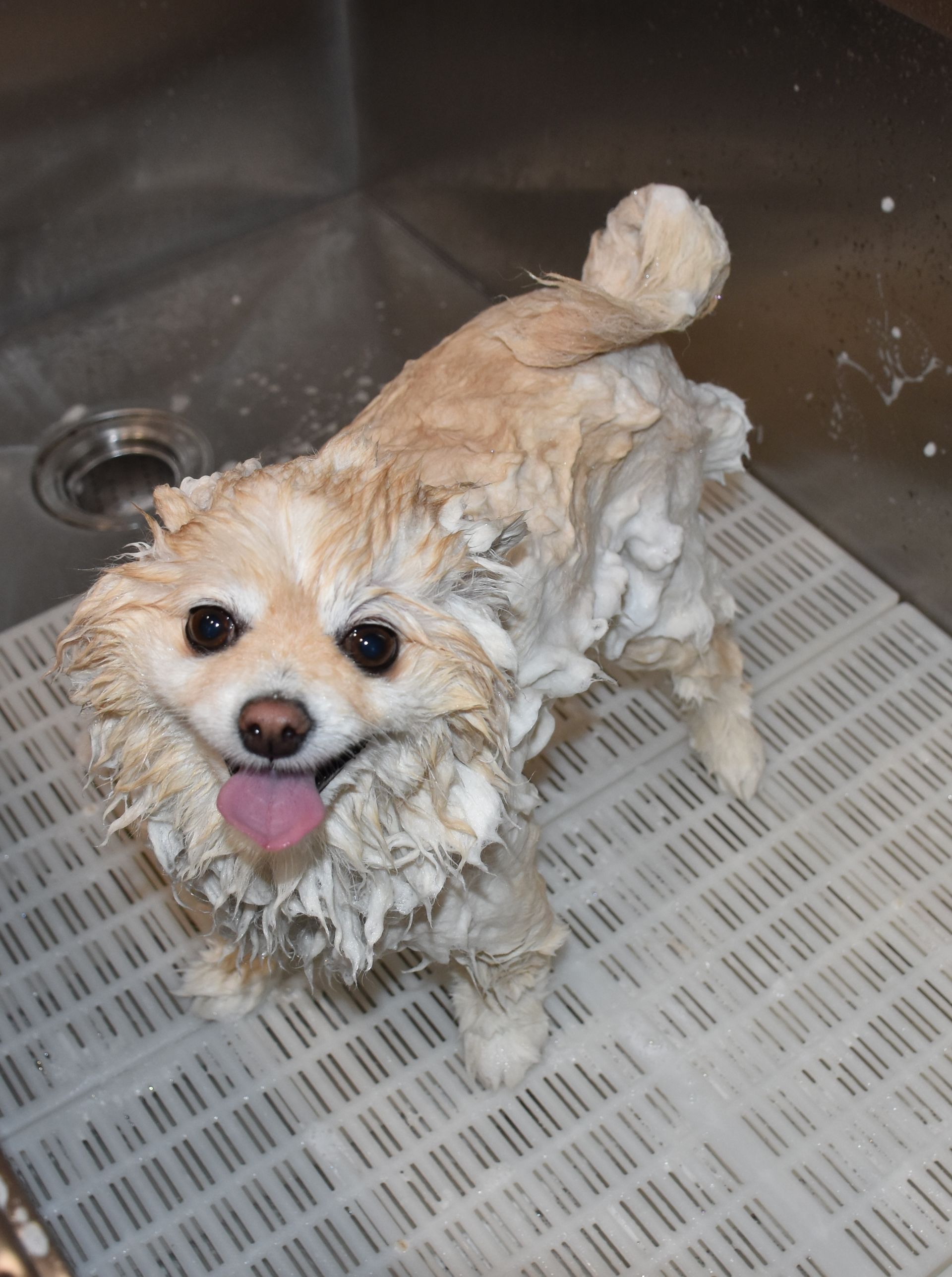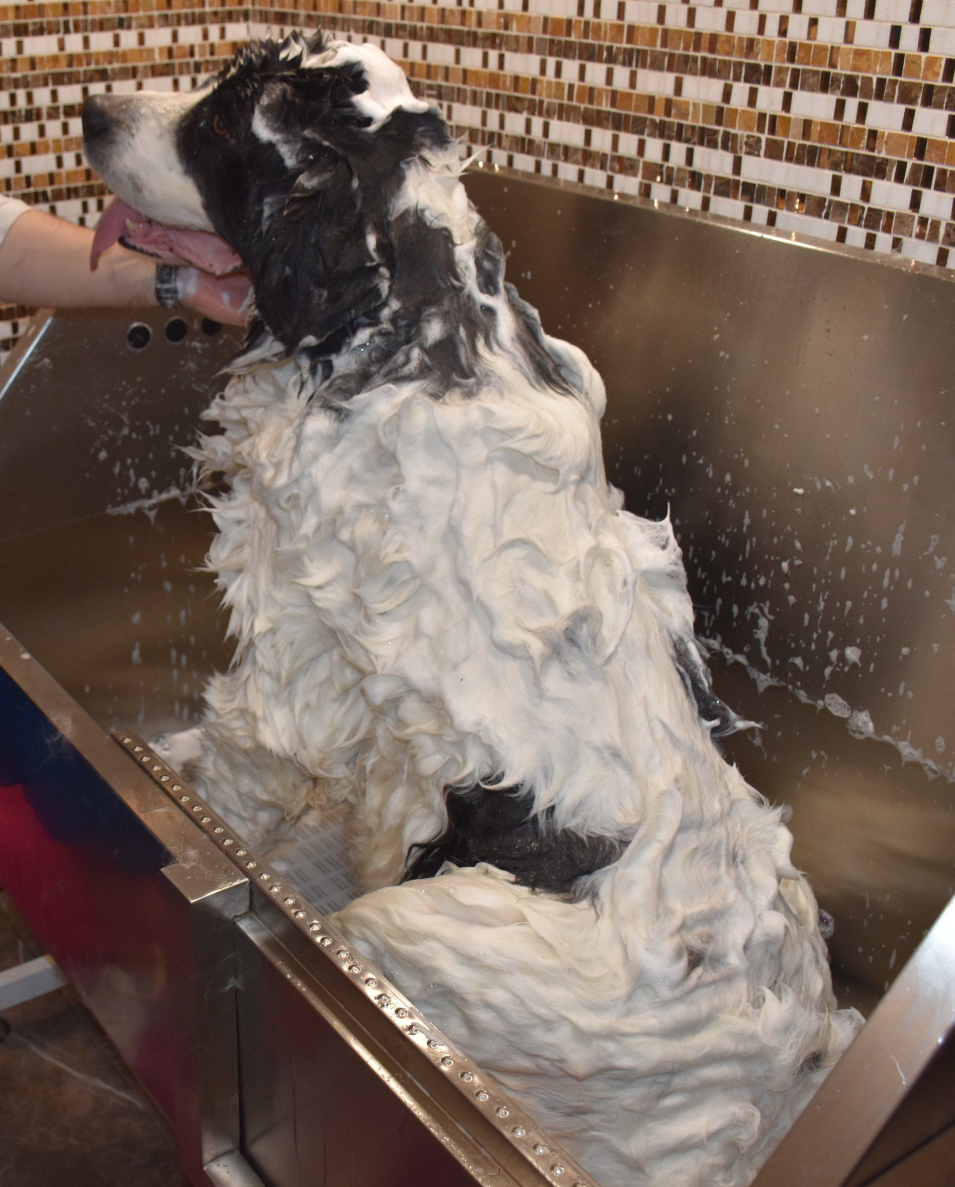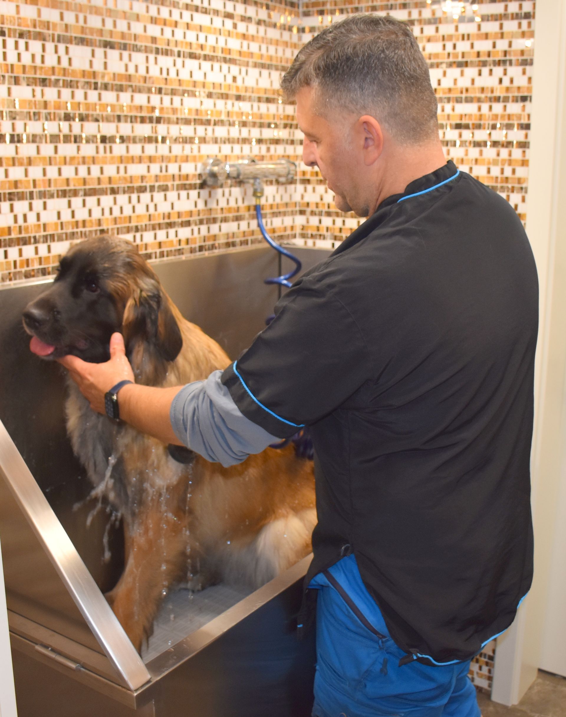 Grundsätzlich benutzen wir ein Shampoo und einen Conditioner der auf das Fell und die Haut Ihres Hundes abgestimmt wird. Sollten Sie ein spezielles Shampoo wünschen zum Beispiel Vegan oder Duftneutral sprechen Sie und bitte an. Wir achten auf die richtige Wassertemperatur. Die wir selbstverständlich beliebig regulieren können. Anbei sehen Sie Bilder eines kleinen Hundes und eines großen Hundes der im Salon gebadet wurde.