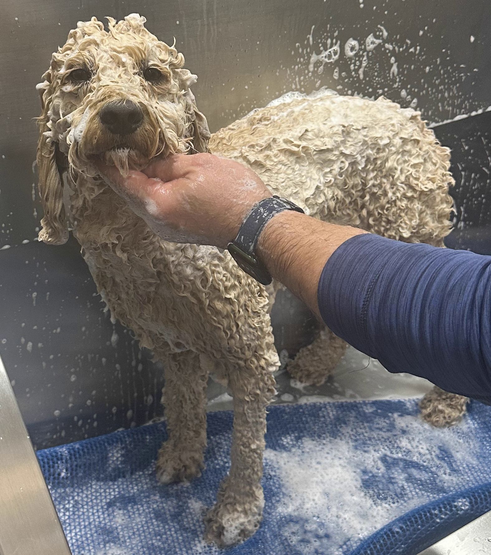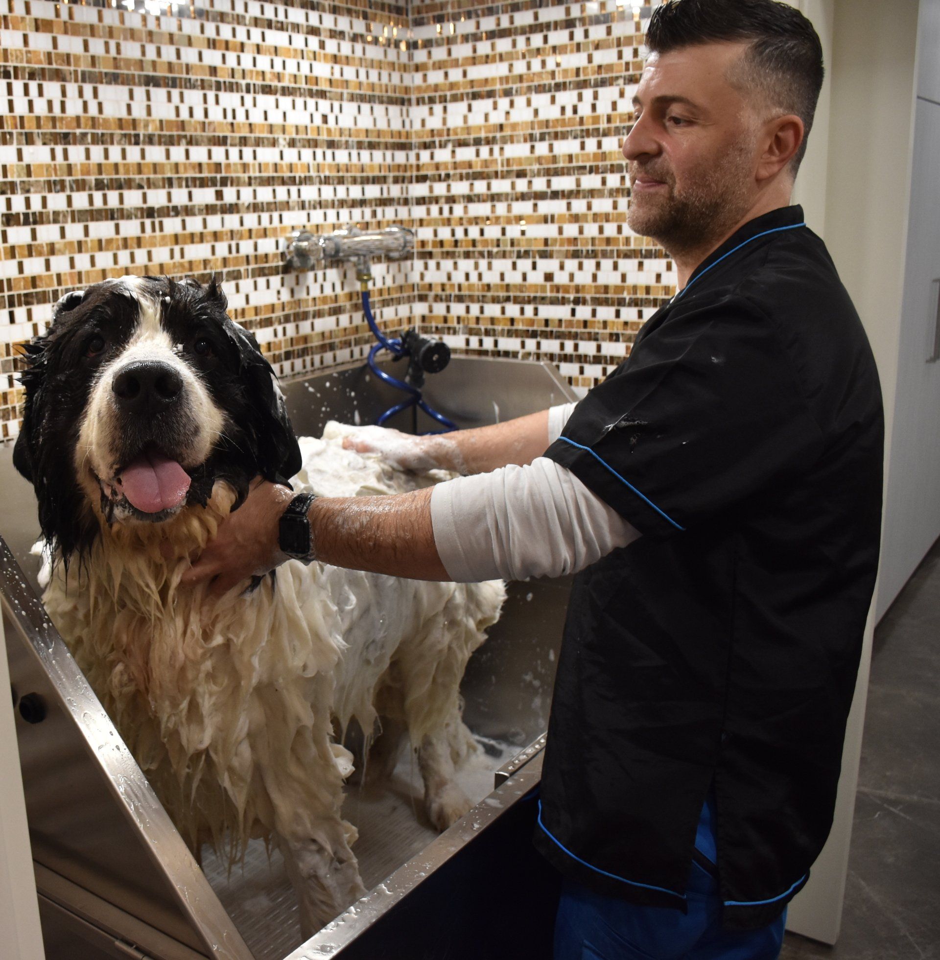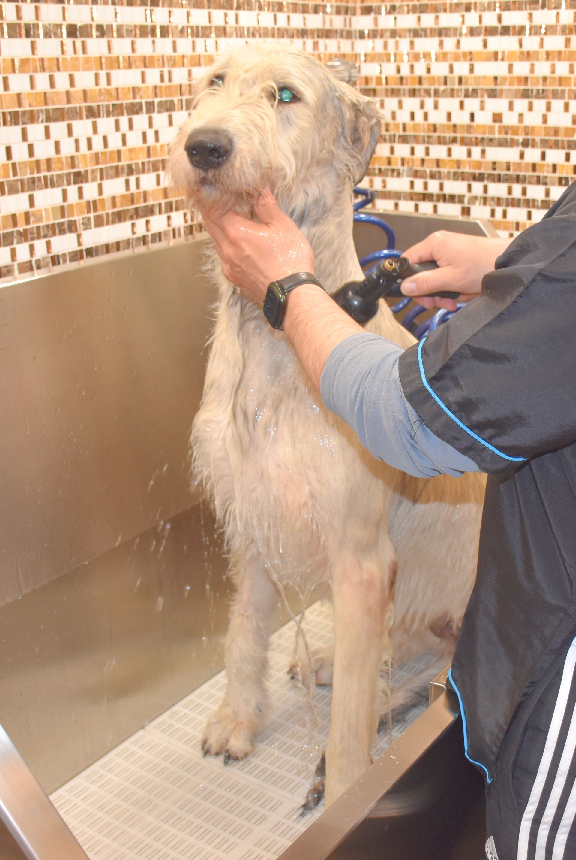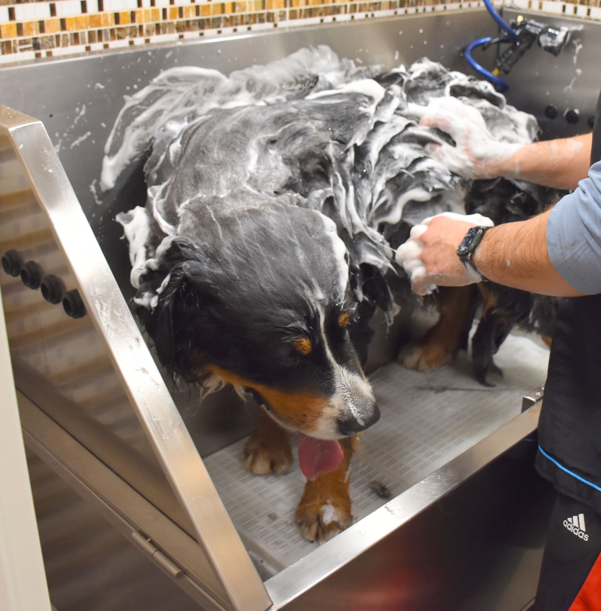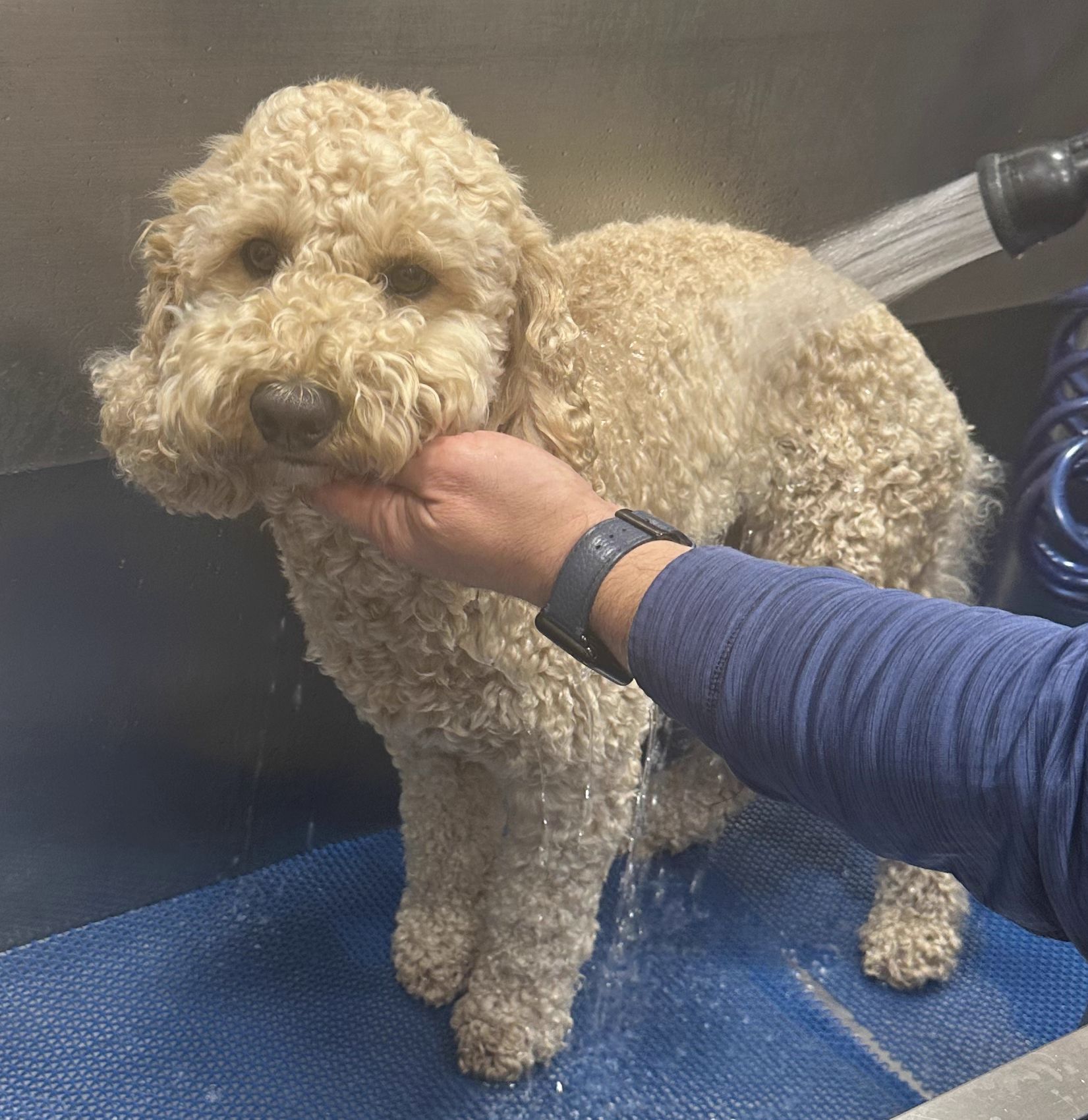 Grundsätzlich benutzen wir ein Shampoo und einen Conditioner der auf das Fell und die Haut Ihres Hundes abgestimmt wird. Sollten Sie ein spezielles Shampoo wünschen zum Beispiel Vegan oder Duftneutral sprechen Sie und bitte an. Wir achten auf die richtige Wassertemperatur. Die wir selbstverständlich beliebig regulieren können. Anbei sehen Sie Bilder eines kleinen Hundes und eines großen Hundes der im Salon gebadet wurde.