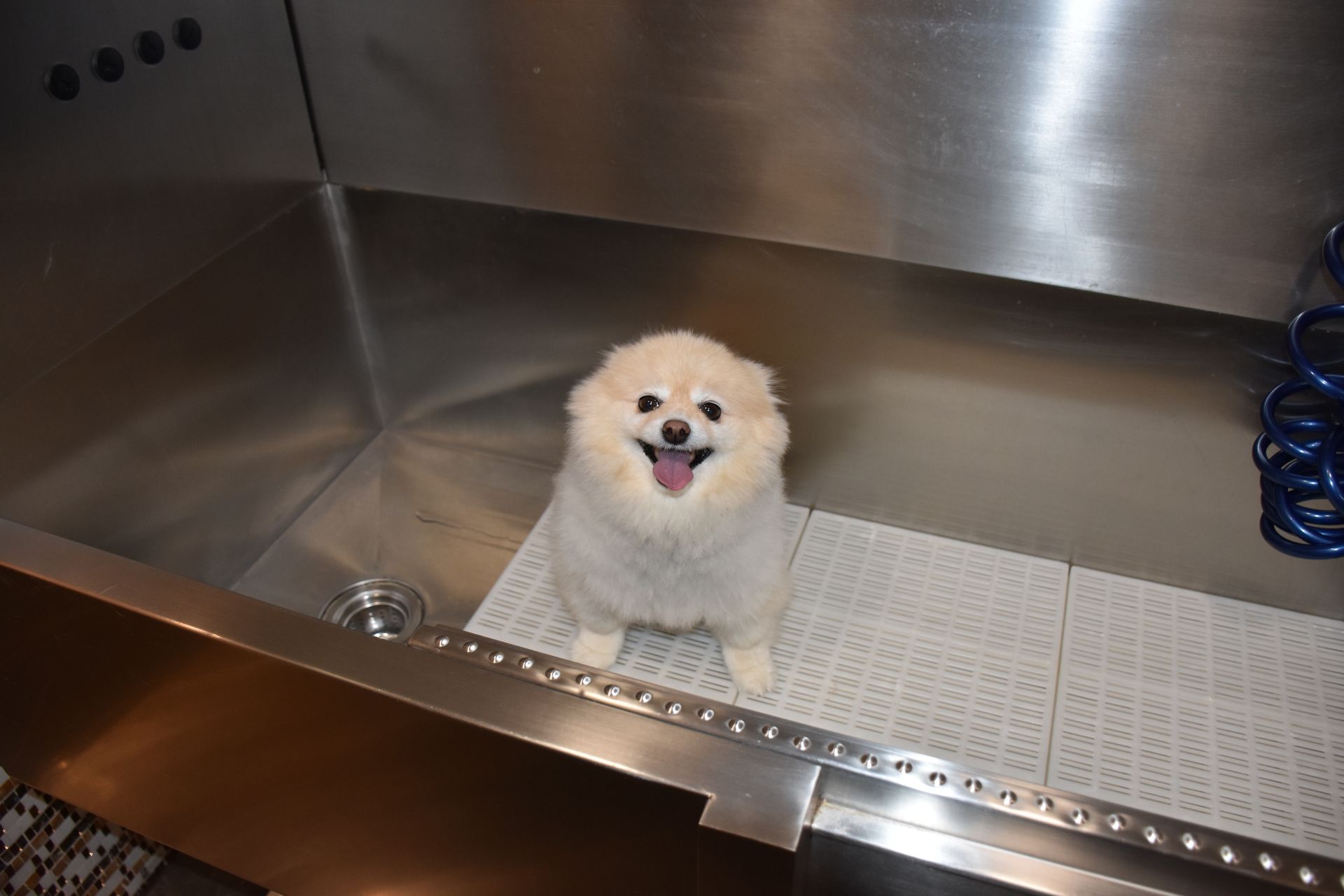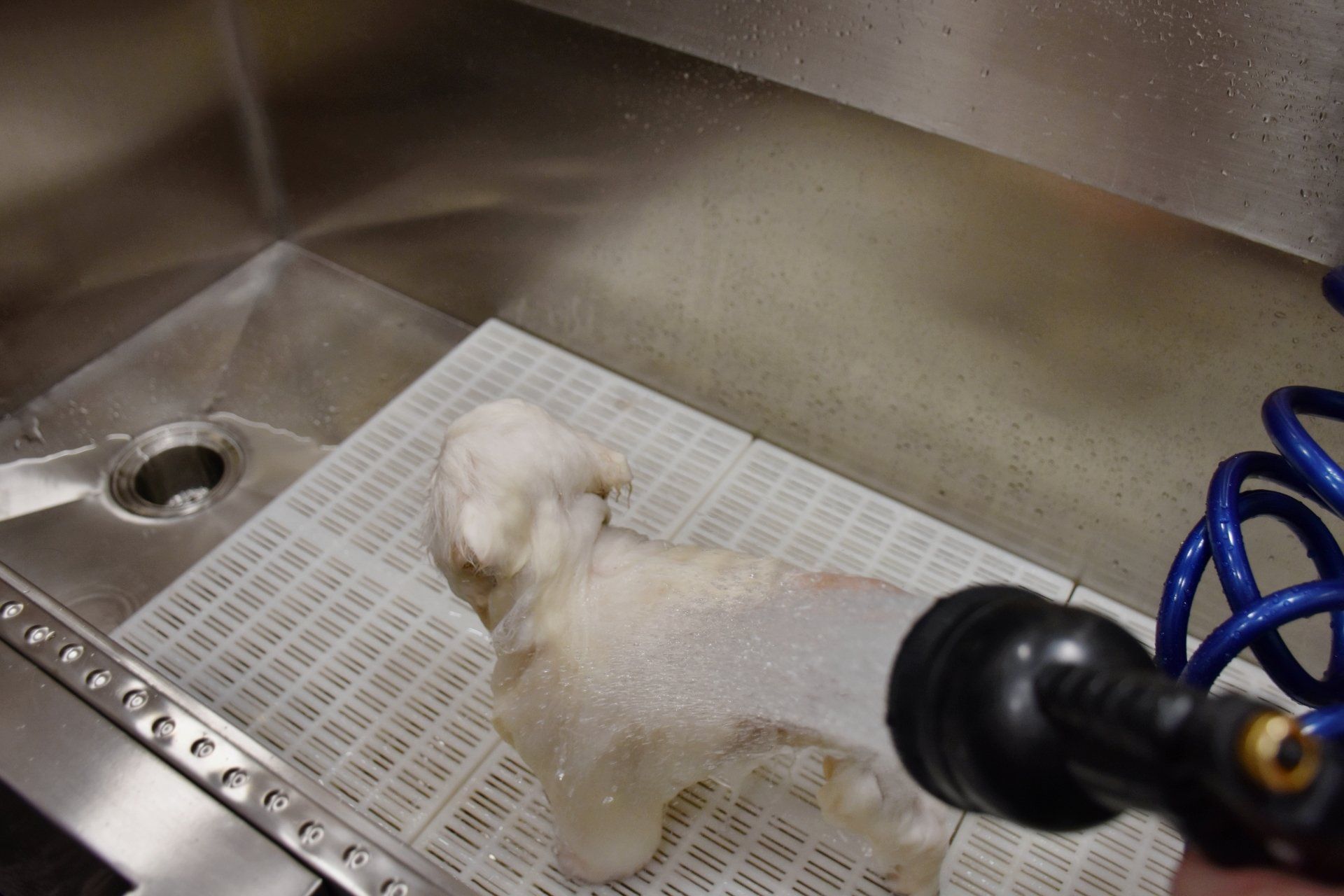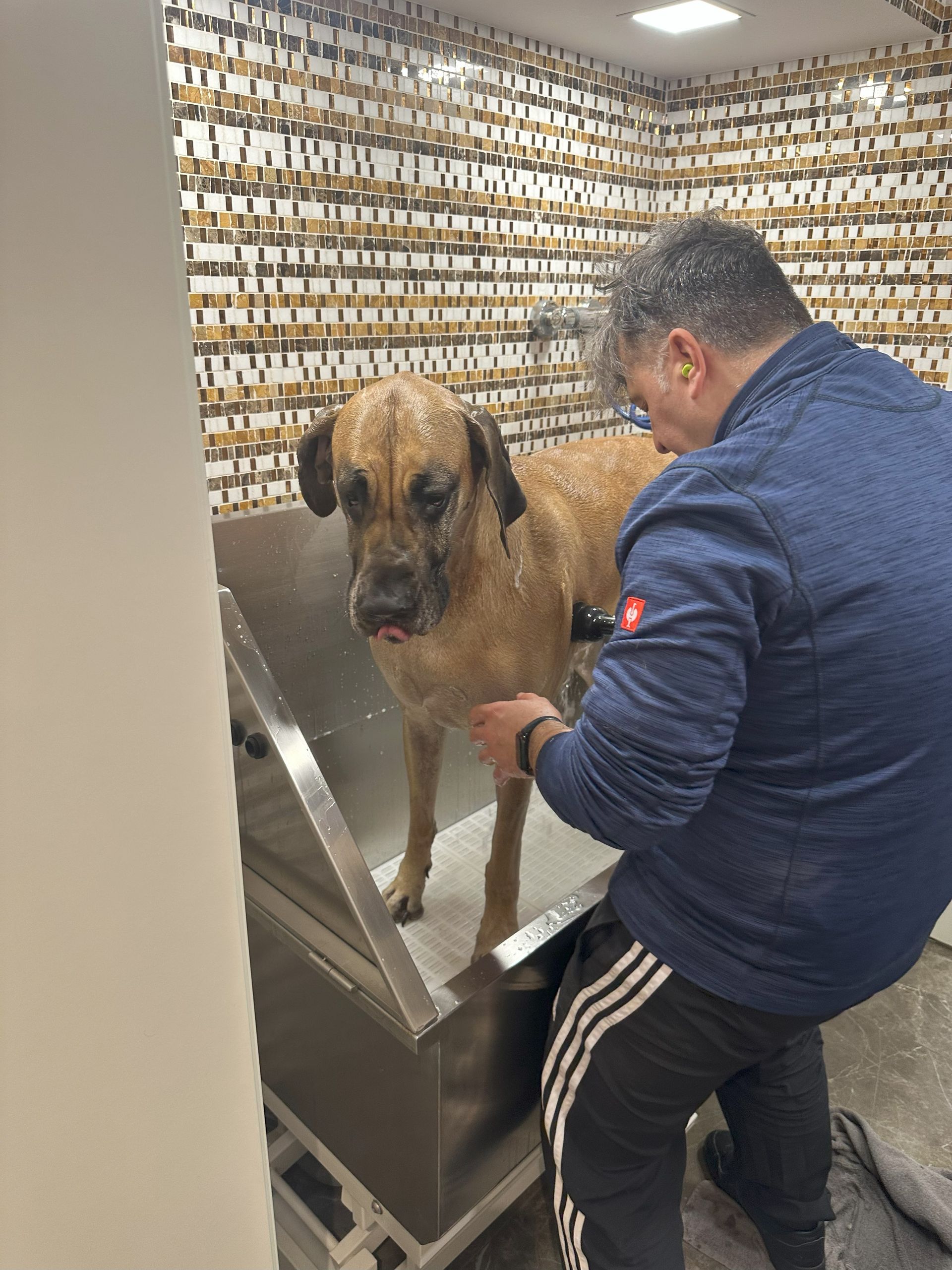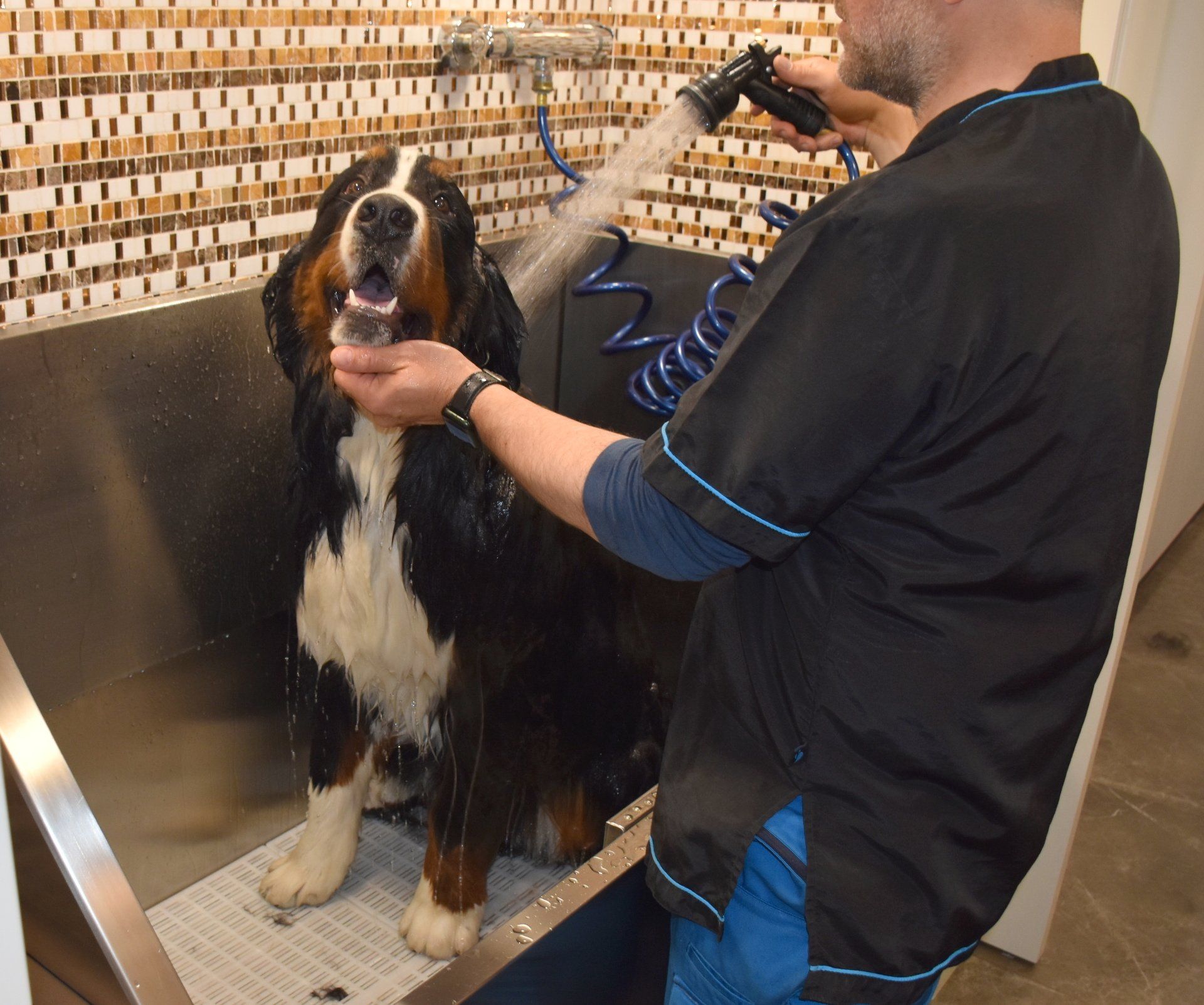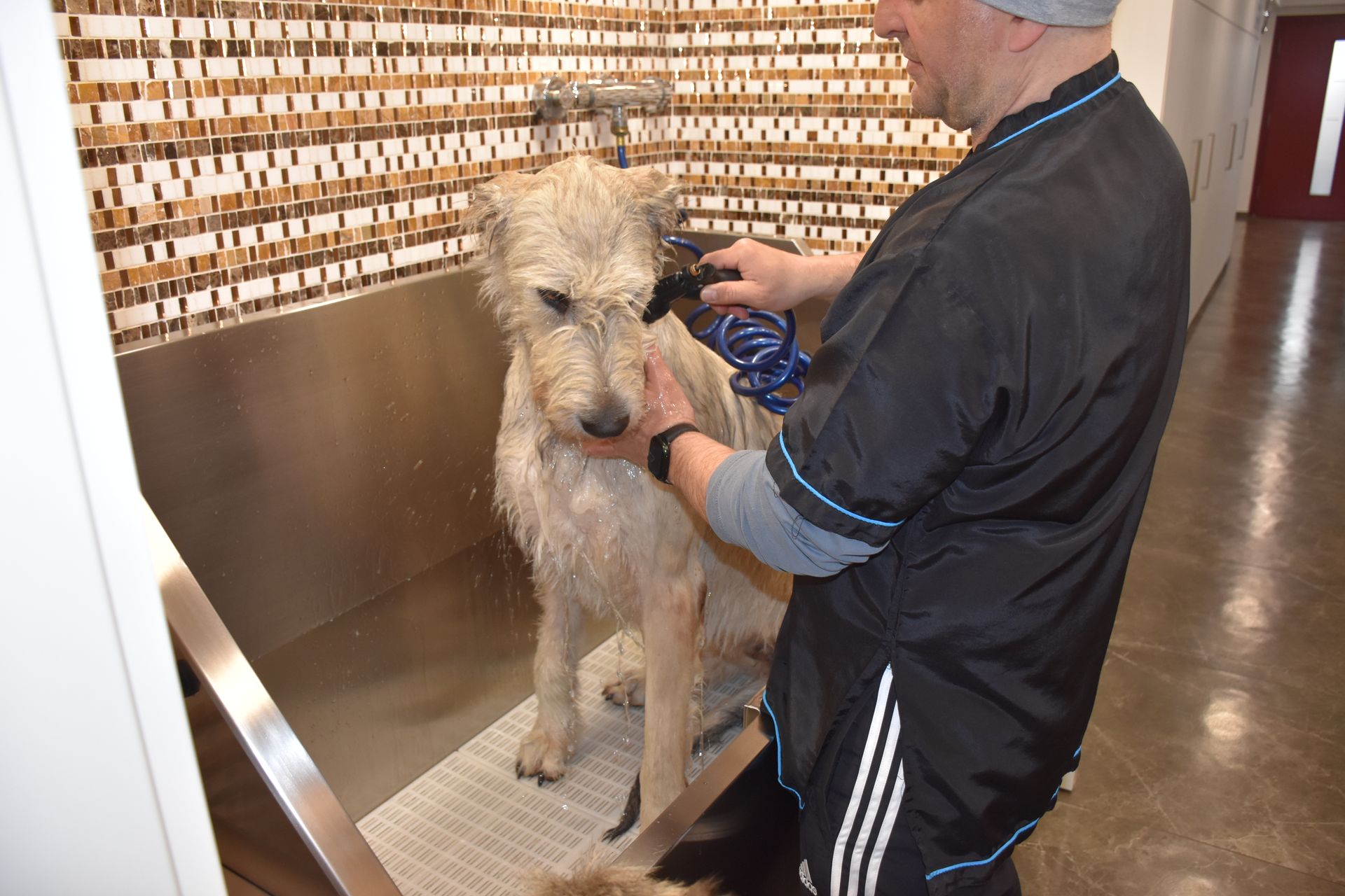 Grundsätzlich benutzen wir ein Shampoo und einen Conditioner der auf das Fell und die Haut Ihres Hundes abgestimmt wird. Sollten Sie ein spezielles Shampoo wünschen zum Beispiel Vegan oder Duftneutral sprechen Sie und bitte an. Wir achten auf die richtige Wassertemperatur. Die wir selbstverständlich beliebig regulieren können. Anbei sehen Sie Bilder eines kleinen Hundes und eines großen Hundes der im Salon gebadet wurde.
