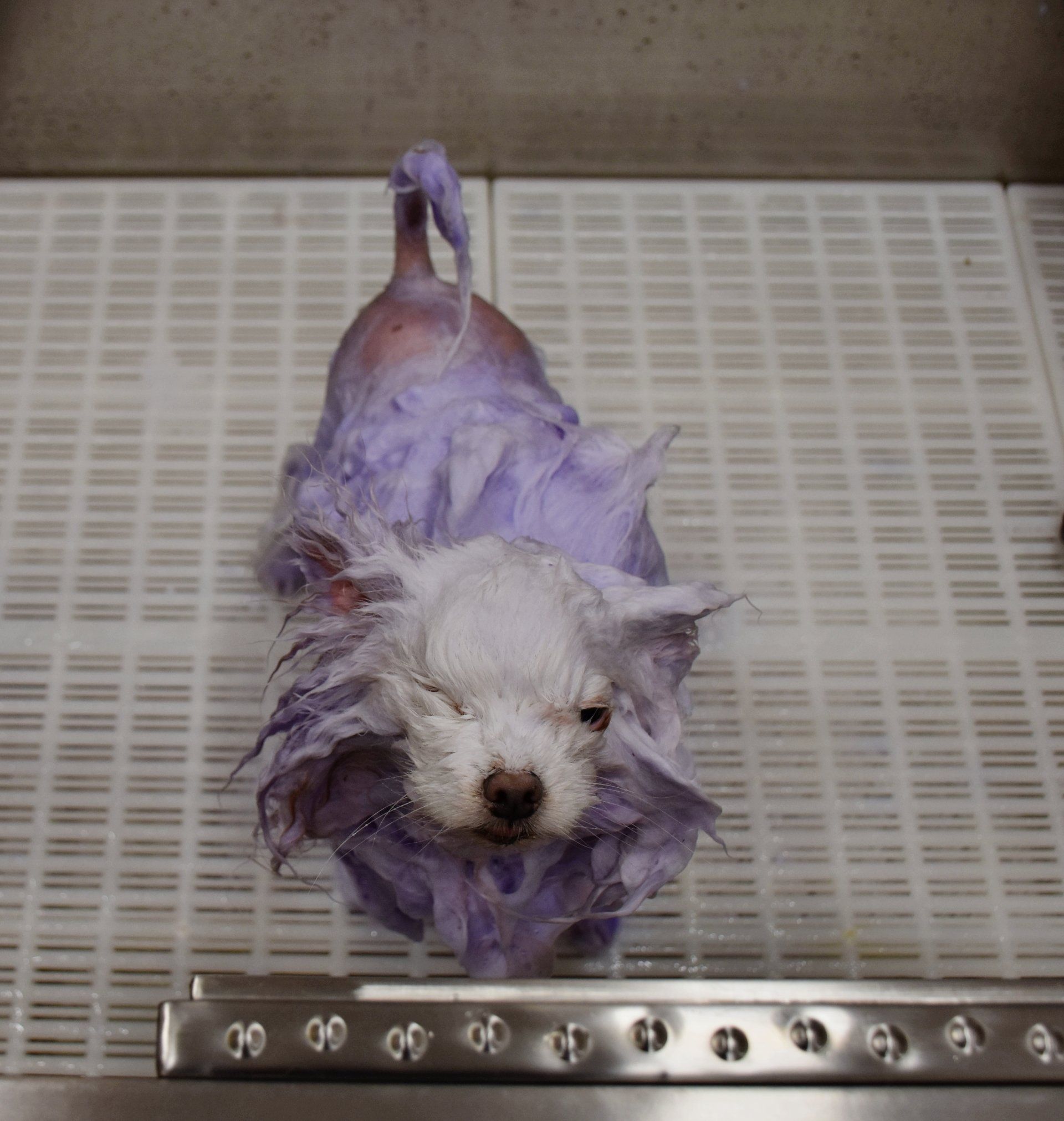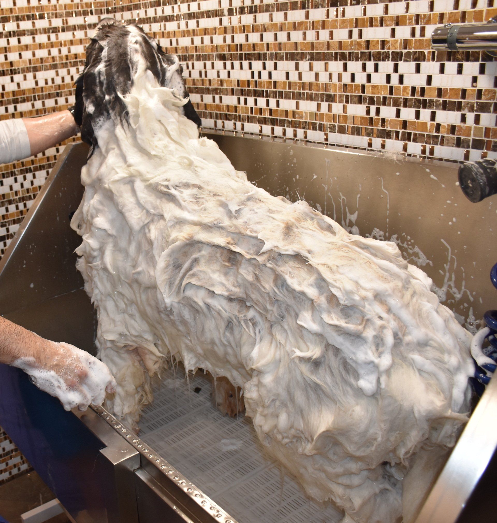 Alle Hunde werden mit einem speziellen Hundeshampoo von einer der genannten Pflegeserien gebadet "Starfire, Christ Christensen, PetSilk, Iconic, Yuup oder Bubbles".